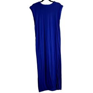 LANVIN Paris Blue Silk Ruched Midi Dress Size M Sleeveless Fringe Hem Luxury