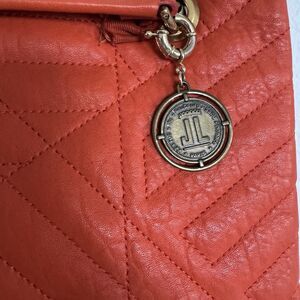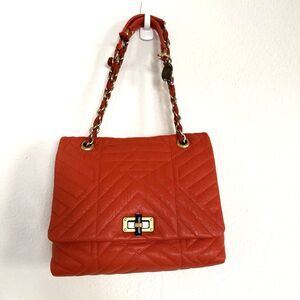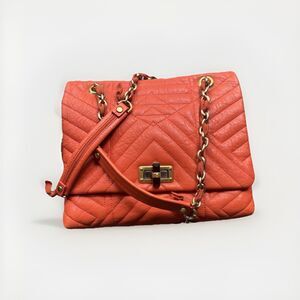 The LANVIN Quilted Lambskin Happy Medium Coquelicot Orange shoulder bag is a stylish and luxurious accessory for women. Crafted from high-quality leather with a quilted finish, this bag features a vibrant orange exterior and gold hardware accents. The medium size and happy character make it a versatile and cheerful addition to any outfit. With a luxurious lambskin lining in a warm brown tone, this bag exudes sophistication and elegance, perfect for adding a touch of glamour to any ensemble. Made in Italy, this Lanvin bag is a must-have for any fashion-forward woman.