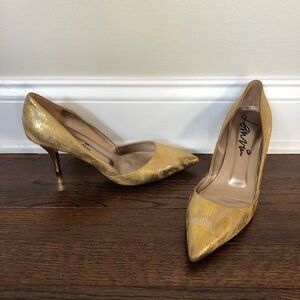 Details: LANVIN Gold Metallic Jacquard Heels/Pumps. Heel height is approx 3”. Width is standard. Pointed toe. Closed toe. Perfect for weddings, special events, night out, etc.
