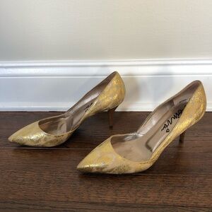 LANVIN Women’s 37.5 (7 US) Gold Metallic Jacquard Heels w/Leather Sole - GUC!