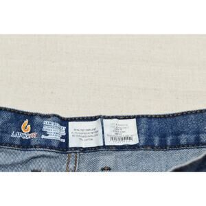 These men's LAPCO FR jeans are designed for safety and durability in demanding work environments. Made from 100% cotton, they are flame resistant and compliant with NFPA 70E and NFPA 2112 standards. The jeans feature a classic blue denim pattern and a comfortable regular fit. The images show a waist measurement of approximately 19 inches, which corresponds to a 38-inch waist, and an inseam of approximately 31 inches, close to the stated 32 inches on the tag. The item is in good used condition with some minor signs of wear and fading consistent with normal use, including some light stains on the legs. There are no visible tears or holes. The closure is a zipper and button fly. Perfect for work or casual wear, these jeans offer protection and comfort. Please review all images for a detailed look at the item's condition and measurements.