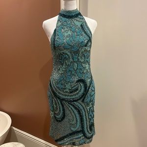 Stunning. Bought for a concert and never went so it’s never been worn out just tried on. Zip closure. Unbelievable detail and color. Great high collar neckline
