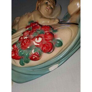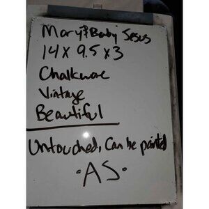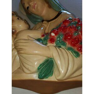 This large 1940s chalkware of Mary and Baby Jesus is a stunning multicolored piece. Measuring 14x9.5x3, it features a hook on the back for easy hanging. Perfect for a smoke-free and pet-free home.
