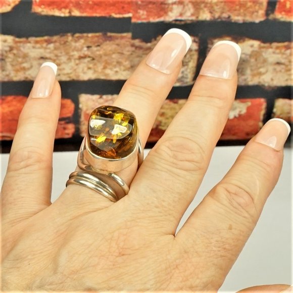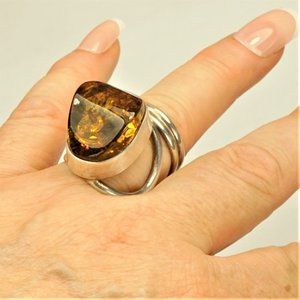 LARGE BALTIC AMBER 925 SILVER ADJUSTABLE RING, UNIQUE DESIGN, GIFT FOR WOMEN