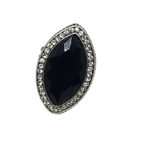 LARGE BLACK GLASS STONE & WHITE RHINESTONE SILVERTONE STRETCH COCKTAIL RING