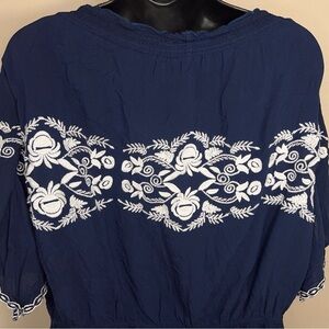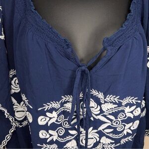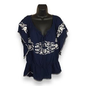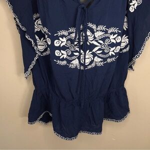 LARGE CECILO DARK BLUE AND WHITE EMBROIDERED BOHO VNECK BOHEMIAN FLORAL