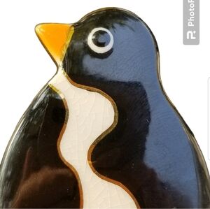 Very cute large penguin pin made of ceramic and handglazed enamel. Pin measures 2-3/4 inches long and 1-3/4 inches wide. Great condition.