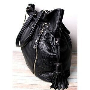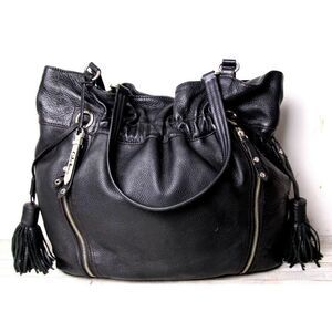LARGE Cole Haan BLACK GENUINE LEATHER ZIPPERS TASSELS DRAWSTRINGTOTE SHOULDER BAG HANDBAG PURSE