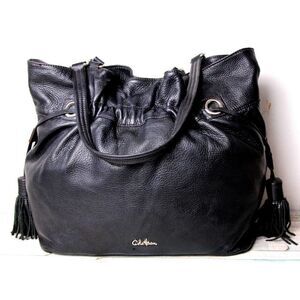 LARGE Cole Haan BLACK GENUINE LEATHER TASSELS TOTE SHOULDER BAG HANDBAG PURSE