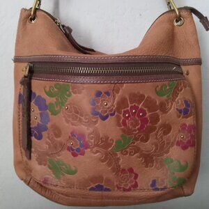 LARGE FOSSIL CROSSBODY HANDBAG, IN EXCELLENT CONDITION. THERE IS A FLOWERED PATTERN ON THE