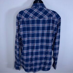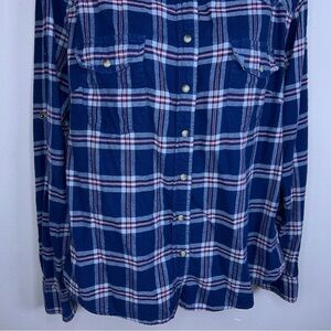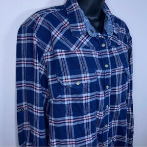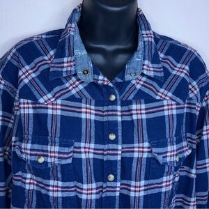 LARGE JACHS GIRLFRIEND BLUE FLANNEL LONG SLEEVE SNAP BUTTON TOP COTTON PLAID