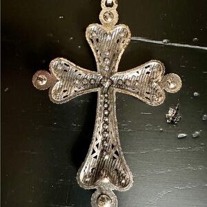 LARGE METAL, SILVER TONE CROSS PENDANT. 4 CROWN POINTS WITH RHINESTONES. 2 7/8”W X 6 3/8”L