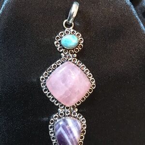 LARGE NATURAL GEMSTONE PENDANT ROSE QUARTZ~CHEVRON AMETHYST & LARIMAR 🌟NEW🌟