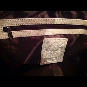 Beautiful Large shoulder bag purse in cream-colored / off white/ ivory leather. Preowned In great condition. measures 12.5" high, 6" deep, & 16" long. The strap drop is 15.5 inches (measured from the center of the strap to the top of the bag). top of the bag closes with a long zipper, & there is a zippered pocket on the front plus 2 lockable cargo pockets. Inside, there is a cell phone pocket, another open pocket, & a zippered compartment.
