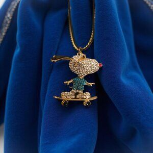 LARGE RHINESTONE SKATER SNOOPY VINTAGE ON BLACK THONG NECKLACE 18 INCH
