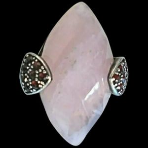 This lovely & most powerful ring has a central rose quartz, multi-faceted stone with double points. The Quartz is accompanied by eight (8) small round deep red Garnets on either side lending to one nice expressive impresssive piece. The center focal measures 1 1/2" x 1", a royal ring indeed.