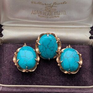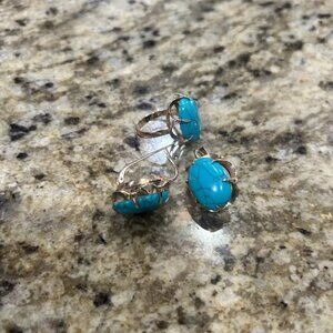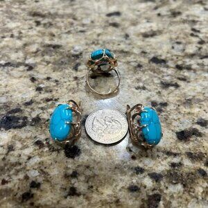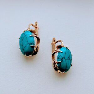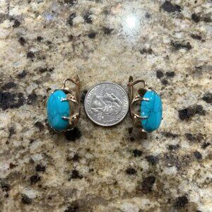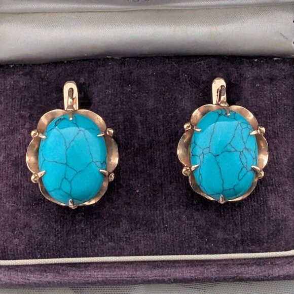 PLEASE SEE THE MATCHING RING IN ANOTHER LISTING! GORGEOUS LARGE Russian Russia solid 14K Rose Pink Gold Prong Set Turquoise Cabochons Pierced Dangle Earrings with Secure Russian Lock (marked and acid tested). They measure about 1 1/16" in length (with post part) by about 3/4" in their widest. Turquoise cabochons are about 19.5mm by 15mm. These unique earrings weigh approximately 10.6 grams and are in great pre-owned condition.