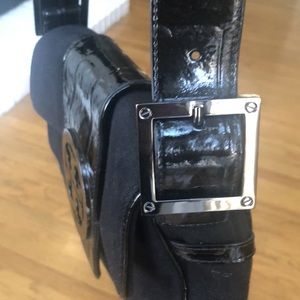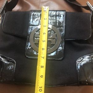 Black canvas and patent leather shoulder strap purse. Two inside pockets plus one zipper pocket.