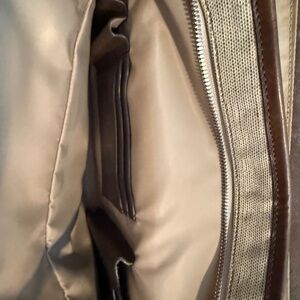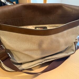 Genuine, authentic, Tumi Bag. The dark brown is leather and the lighter color is a vinyl of sorts. They are many pockets, dividers, spaces for all sorts of items. There is even a hidden zippered compartment on the bottom. The bag is in perfect condition. I rarely used it and now that I'm retired, I don't need such a roomy bag. It has crossbody strap that can be shortened. I listed it as crossbody bag, and it can also work as a computer bag or even a diaper bag. It measures 16" X 12" X 3.5".