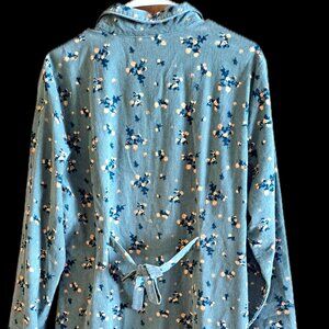 VCS 48" long Size Large sage green pinwale corduroy dress has pintucking on bodice and buttons down the length of the dress. It has adjustable tie-backs and side-seam pockets and a yellow-and-blue floral print. Loose, easy drape. Pit to pit, 22", shoulder to hem, 26". 100% cotton, easy care. Excellent condition. Featured photo is truest color.