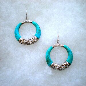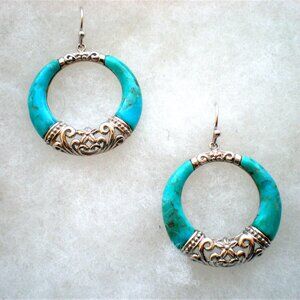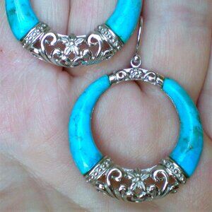 Gorgeous LARGE Artisan Designer NF signed solid Sterling Silver 925 genuine Turquoise Dangle Pierced Earrings approximately 12.1 grams (marked on backs "NF 925 Thailand" and acid tested). They are about 1 3/4" in length (with hooks) and about 1.25" in their widest, dangle part is about 1 5/16". These unique Earrings are in great MINT pre-owned condition. retail between $149-400 stauer timeless turquoise earrings