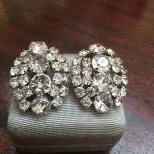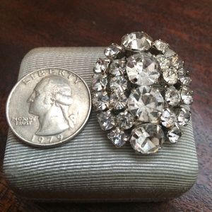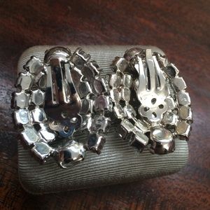 Vintage clip on rhinestone earrings. These definitely make a statement! Not marked on the back. No missing stones. Coin in photo for size reference (they're quite large). Very blingy and a major addition to any costume jewelry lover's wardrobe. These would be great at a costume party or event with the right outfit look. On sale for the weekend!!