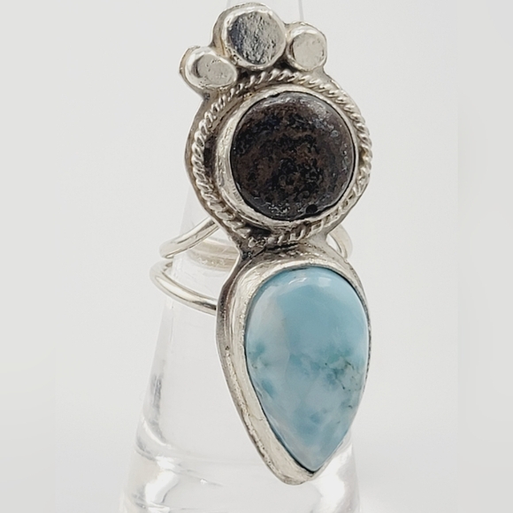 LARIMAR & BRONZITE HANDMADE RING IN STERLING SILVER METAL SIZE 7.5