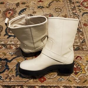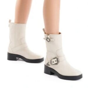 Richly sculpted hardware charms the buckled straps of this retro-chic leather boot crafted from supple leather and grounded on a sturdy stacked heel.