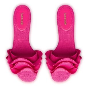 The Larroude Women's Ivy Ruffle Slip On Slide Sandal in Pink Raffia is a stylish and comfortable choice for casual wear. These flat sandals feature a charming ruffle accent on the exterior in a solid pink color. With a leather outsole and canvas lining, these sandals offer both durability and comfort. The slip-on design and flat heel make them convenient for everyday wear during the summer, fall, and spring seasons.