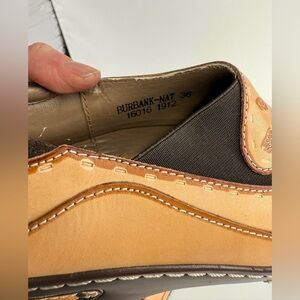 These natural tan clogs, size 36/5.5-6US, feature a sleek leather upper with a comfortable wedge heel, perfect for everyday wear. The rounded toe and wide fit ensure a relaxed and stylish experience. Crafted with quality materials, these shoes offer both durability and a touch of elegance.