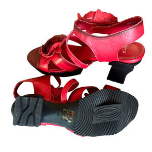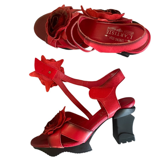 L'ARTISTE by SPRING STEP "Shelly" Women's Size 40/US 9 Red Genuine Leather Ankle Strap Heeled Slingback Open Toe Sandals. Hook & Loop Adjustable Ankle Strap. Dimensional Flowers With Bead Centers. Hand-Painted. Sculpted Platform and Heel. Padded Insole. Gorgeous Shoes. Brand New Without Box. Excellent Condition. Ships within 24 hours.
