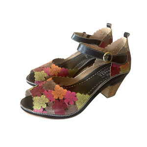 L'ARTISTE Spring Step "Avnia" Women's Size 42/US 11.5-12 Black/Multicolor Leather Autumn Leaves Cut-Outs Comfort Sandals. Ankle Strap Has Hook & Loop Closure Easy On/Off. Floral Laser Etching and Cut-Outs. Stacked Heels. Peep Toe. Contrast Stitching. Super Soft Leather. Brand New. Excellent Condition. Ships within 24 hours.