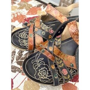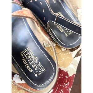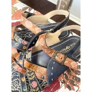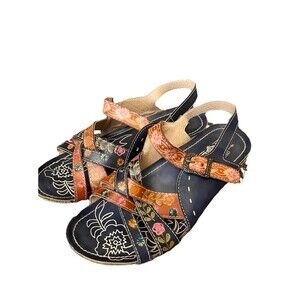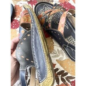 L’ARTISTE Spring Step Tabitha Sandals 39 8 Navy Blue Tooled Leather Buckle