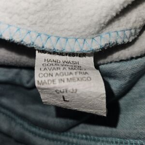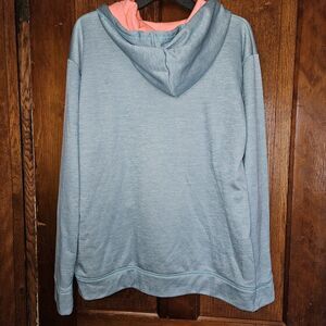 The product is a blue and green coral hoodie in size Large, perfect for casual travel. This pullover hoodie features a round neckline, long sleeves, and a hood for added warmth and comfort. Made of polyester blended fabric, it is machine washable and suitable for all seasons, making it ideal for winter, fall, and spring. The hoodie also includes a logo accent, showcasing its connection to LAS VEGAS and the travel theme, making it a stylish and practical choice for women on the go.