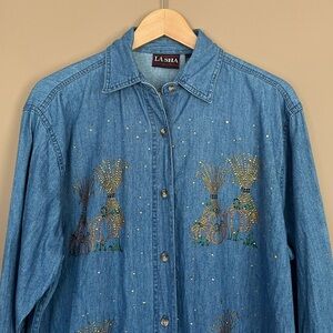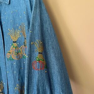 {LASHA} Fall Pumpkin Harvest Rhinestone Scene Denim Button Down Shirt - Medium