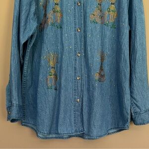 {LASHA} Fall Pumpkin Harvest Rhinestone Scene Denim Button Down Shirt - Womens Medium