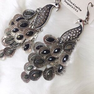 Brand New Antique Silver Toned Peacock Chandelier Earrings adorned with black and grey stones. Length:2.5" Condition: New