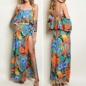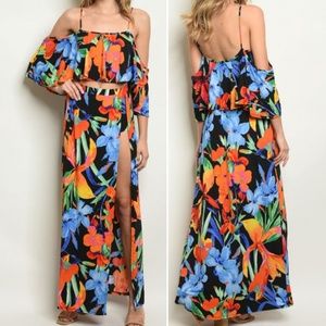 GIRLY & FLRITY 2 PIECE MAXI SKIRT & TOP There is a 2nd color option on separate listing, I have added one photo here at on the last one for the other color Maxi side slit skirt with short underneath Cold shoulder BOHO style top Stretchy fabric Country: USA Fabric Content: 95% POLYESTER 5% SPANDEX Available in Size : M-L Smalls have already sold out with personal friends Model is wearing a small I am wearing a Medium and have a 36g bust and wear a 6 or 8