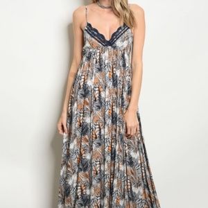 Sleeveless V-neck lace trim printed maxi dress. Adjustable straps.