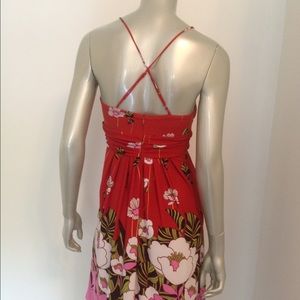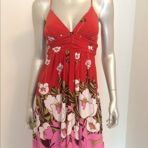 Red and pink fun floral dress. This is the perfect vacation dress. Cute, dress up, dress down, very wrinkle resistant. Empire waist, padded cups and crossed straps. Very flattering.