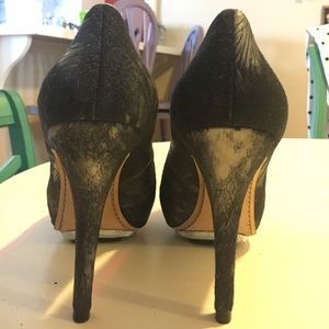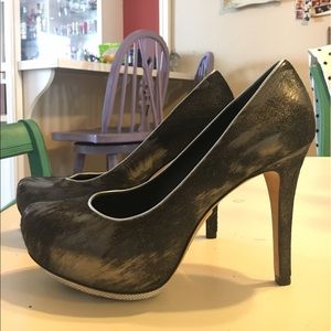 Never been worn, genuine leather metallic dark silver / pewter and grey platform pumps by Alejandro Ingelmo. Incredible detailed material - Has fur like texture blend to the leather. Absolutely gorgeous. Made in Italy. Approximate heel measurement 4” with 1.25” front platform.