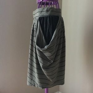 Comfortable and sexy little mini skirt with olive/army green and dark grey stripes. Dark Grey bubble pockets give this mini skirt a draping tulip like look. In excellent condition.