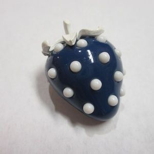 This is a Gorgeous and VERY collectible Crown Trifari Blue Enamel Strawberry and Stem with Lucite Seeds from the Marked Strawberry Collection. Blue appears to be the rarest color as opposed to the orange, gold tone and red berries. It measures 1"x 1 1/2". The mark is shown in the last photo but may be too small to read. Brooch appears to be unused.