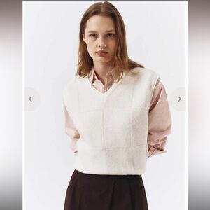 I think it’s the same as the ivory one (pic posted) -Dunst Divide v-neck sweater wool vest with subtle square check pattern.