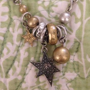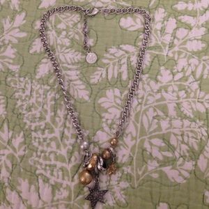 This is a Jessica Simpson star struck necklace with a rustic look. It was one of her original pieces when her line began. It has only been worn twice. The charms and chain appear worn, but that is the rustic look. The only sign of wear/age is that the signature charm has two small signs of oxidation- see last picture below the J and S. Super cute for teens and adults!