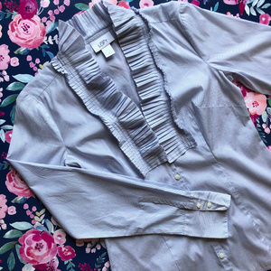 This is a lovely long-sleeved button-up blouse by Ann Taylor LOFT made truly unique by its ruffled neck. Amazing as a layering piece or alone. Excellent used condition.