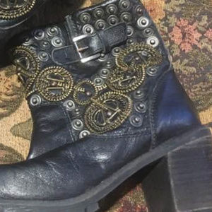 This is a pair of Vintage Goth black leather ankle boots, well-loved and broken in but in very good condition. The ankle area is very decorated like "steampunk" with the illusion of gear and snaps, etc. Size reads "36," which is the U.S. equivalent of 5.5. 2" solid rubber heel.