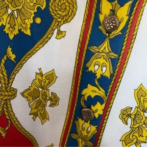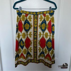 Super fun and unique vintage skirt by Don Manuel of Miami. The scarf, medallion print is so easy to pair with a solid tee, blouse, or sweater. Striking red, blue, and golden yellow in the print. It doesn’t flare out but it’s not exactly like a pencil skirt. Somewhere in between.