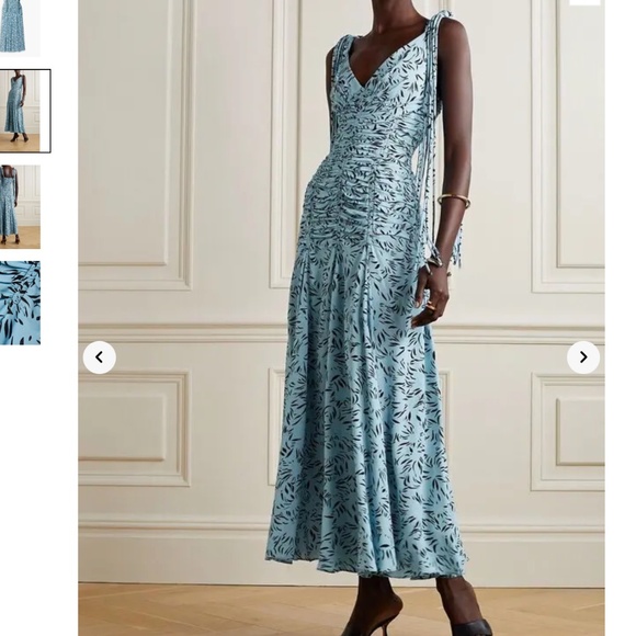 Proenza Schouler's midi dress is made from crepe patterned with a botanical motif that pops against the light-blue backdrop. Designed with a floaty skirt, it has a gathered bodice and self-tie shoulder straps. Style yours with heeled mules or ankle boots.