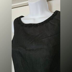 90s/Y2k vintage John Roberts tunic dress-black-soft woven denim feel fabric (cotton/poly)-some stretchiness-wide round boat collar with black beaded/sequin lace edge (front only)-sleeveless-zipper back closure-slight flare bottom-short back slit--not lined-light/medium weight-quality made-about knee length-tag says size 4P (fits like S)-34"/36" bust (possible 32" depending on how you want fit), 32" length,15"/16"waist/18"hip (flat)-very good condition-